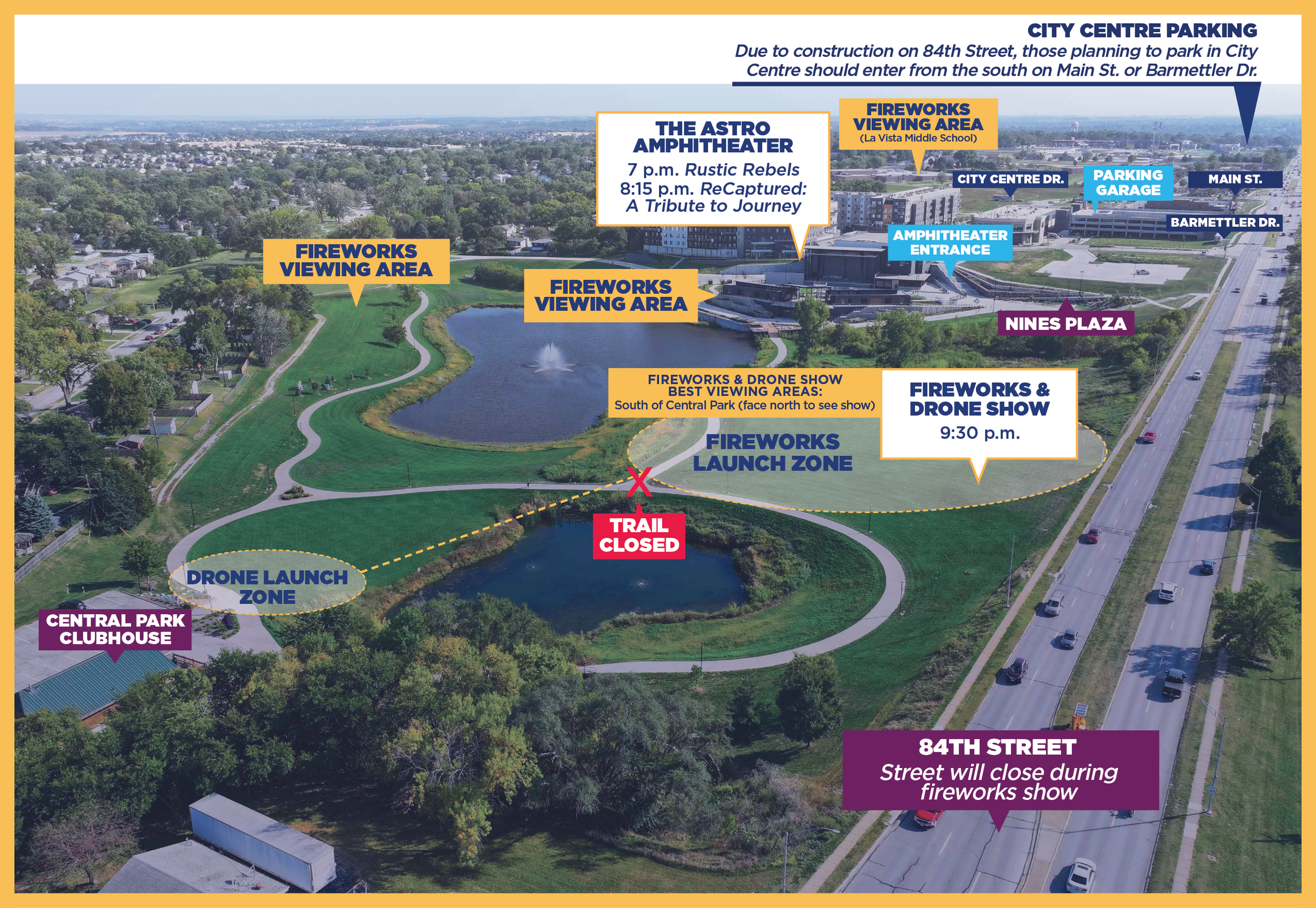 Due to construction along 84th Street, it is recommended to arrive and enter La Vista City Centre from the south at Main Street or Barmettler Drive.